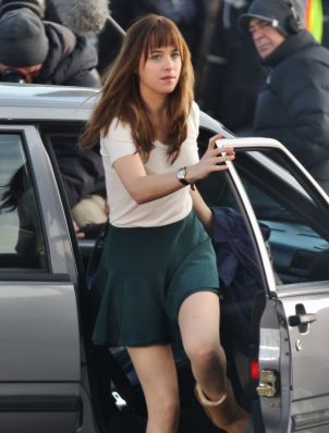 El look que llevaba Dakota Johnson era, sencillamente, terrible. ¿Lo recordáis? Una falda corta de tablas azul verdoso, la camiseta ¿beige? Por llamarle algo, pero era de un color indescriptible. Los vaqueros en los que va literalmente embutida en la escena de la bicicleta, la gabardina/trenca marrón… En fin, sin palabras.